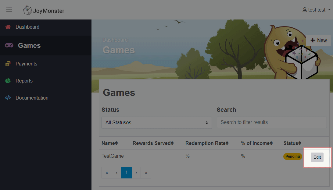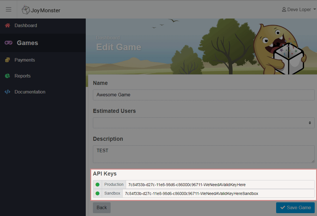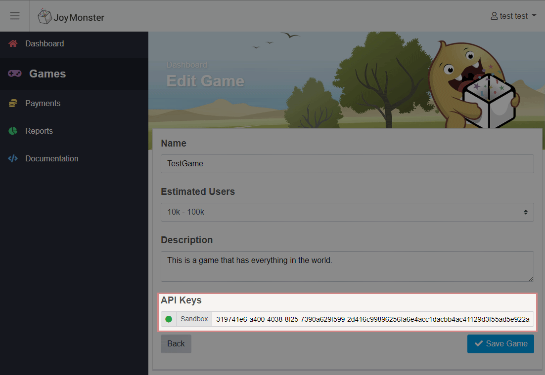 Once your game has been approved by the JoyMonster team, a production API key will be issued, and will be available on the "Edit Game" page, which you may then insert into your Unity settings.