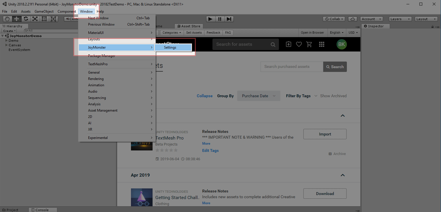 Download and install the JoyMonster plugin from the Unity store. Once the download has completed, import the plugin into your project using the import button on the package in the unity store.
